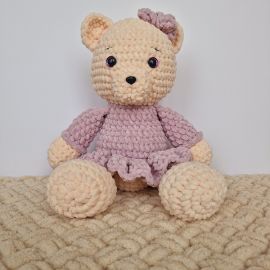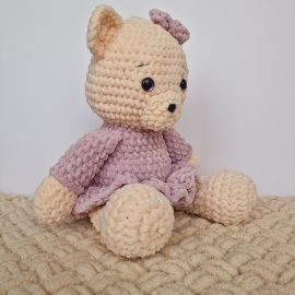 Այս հմայիչ ծիրանագույն արջը յասամանագույն զգեստով հիանալի նվեր կլինի երեխաների և մեծահասակների համար, ինչպես նաև հիանալի դեկորատիվ տարր ձեր տանը: Ստեղծված սիրով և մանրուքների նկատմամբ ուշադրությամբ՝ խաղալիքը ձեռքի աշխատանք է, օգտագործելով բարձրորակ նյութեր՝