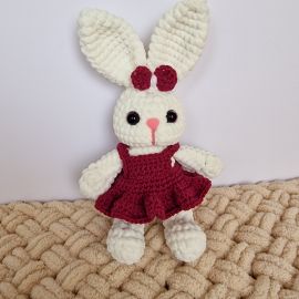 Փափուկ պլյուշ մանվածքից այս հմայիչ ձեռագործ նապաստակը հիանալի նվեր կլինի երեխայի համար կամ նորաոճ դեկորատիվ տարր: Ձյունաճերմակ փափկամազը հագած է գործված բորդո զգեստ, որն ավելացնում է անհատականություն և հմայք։ Խոշոր արտահայտիչ աչքերը և գեղեցիկ մռութիկը այս նապաստակին