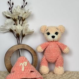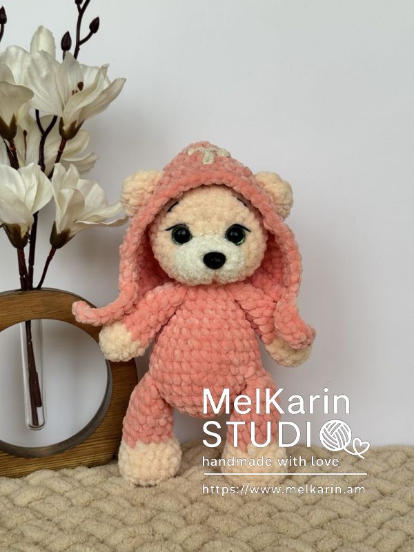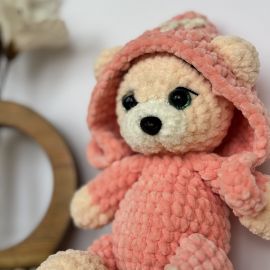 Очаровательный вязаный медвежонок ручной работы в уютном персиковом костюмчике с капюшоном. Создан из мягчайшей плюшевой пряжи, он станет прекрасным подарком для ребёнка или стильным элементом декора детской комнаты.