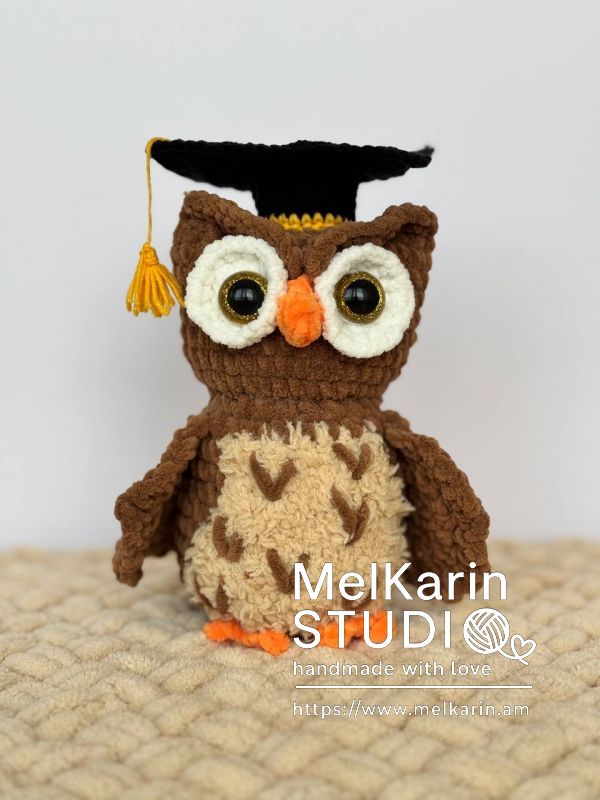 Очаровательная вязаная сова в выпускной шапочке — идеальный подарок для выпускников! Символ мудрости и знаний, этот милый персонаж обязательно поднимет настроение и станет трогательным напоминанием об особом дне. Выполнена вручную из мягкой пряжи, с любовью и