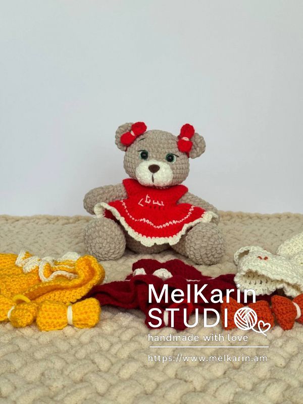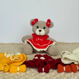 Այս ձեռագործ արջուկը ոչ միայն հմայիչ է, այլև ունի մի քանի հագուստ՝ փոփոխելու համար։ Հագին ունի կարմիր զգեստ։ Բացի այդ, ներառված են մի քանի այլ զգեստներ՝ տարբեր գույներով, որոնք երեխան կարող է փոխել ըստ ցանկության։