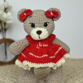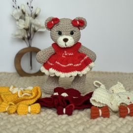 ԱվելացնելԱյս ձեռագործ արջուկը ոչ միայն հմայիչ է, այլև ունի մի քանի հագուստ՝ փոփոխելու համար։ Հագին ունի կարմիր զգեստ։ Բացի այդ, ներառված են մի քանի այլ զգեստներ՝ տարբեր գույներով, որոնք երեխան կարող է փոխել ըստ ցանկության։