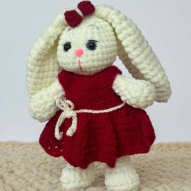 Այս հմայիչ ձեռագործ նապաստակը կատարյալ նվեր է փոքրիկների համար և կարող է գեղեցկացնել տան ինտերիերը։ Նապաստակը հյուսված է կաթնագույն փափուկ թելից, իսկ վառ դեղին, կամ բորդո զգեստները ու քաղցր ժպիտը նրան դարձնում են անզուգական կերպար։ Բնական և հիպոալերգիկ նյութերը