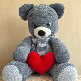Большой плюшевый мишка ручной работы станет идеальным подарком для ваших близких. Сине-серый мягкий мишка держит в лапках яркое красное сердце, символ любви и нежности. Приятный на ощупь материал, выразительные глазки и милый образ делают его любимцем как для детей, так