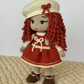 Очаровательная вязаная кукла ручной работы выполнена в технике амигуруми. Кукла одета в яркое оранжевое платье с белыми вставками, берет и туфельки. Рыжие кудри и выразительные глазки придают ей особую индивидуальность. Отличный подарок для детей и коллекционеров, а