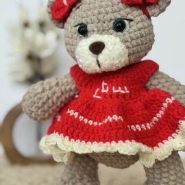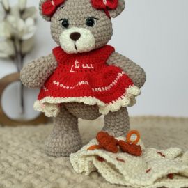 Милый вязаный медвежонок с гардеробом — мечта каждого ребёнка! Этот плюшевый мишка одет в яркое красное платье и украшен бантиками. В комплекте также идут дополнительные сменные наряды — платьица разных цветов с бантиками, которые можно менять по настроению.