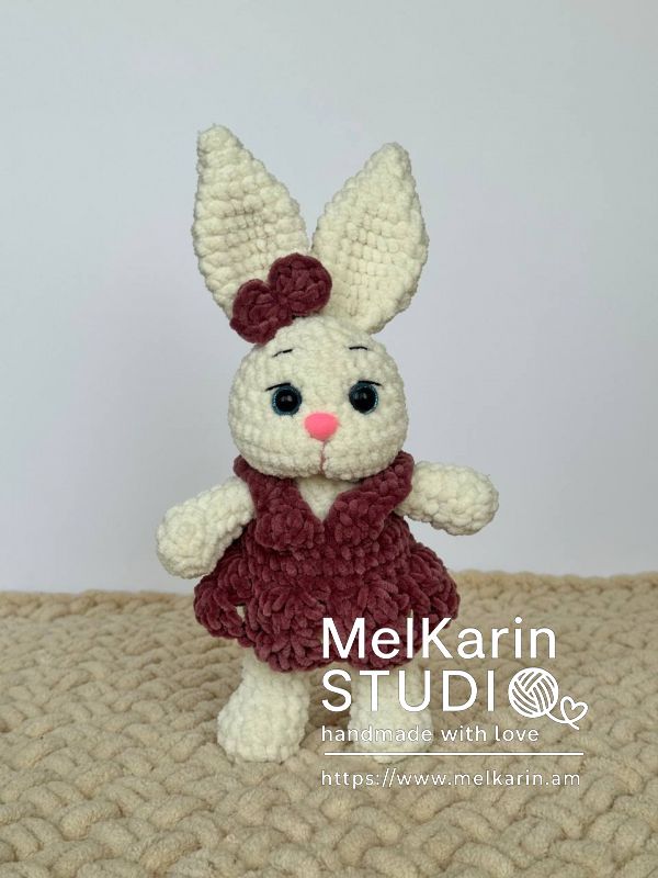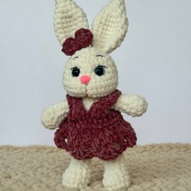 Милая вязаная зайчиха в бордовом платье — нежный и трогательный подарок, который не оставит равнодушным ни ребёнка, ни взрослого! Изготовлена вручную из гипоаллергенной, мягкой плюшевой пряжи. Ярко выраженные ушки, розовый носик и аккуратный бантик придают игрушке