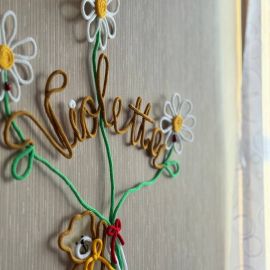 Очаровательное настенное украшение с именем Violetta — это уникальный элемент декора, выполненный в технике трикотин (tricotin). Каждая буква и деталь выложены вручную из мягкой хлопковой пряжи, благодаря чему изделие выглядит особенно нежно и аккуратно.